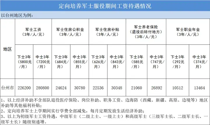 通过定向士官入伍的一般为技术型军士,和应征入伍的“2年兵”有很大的差异。通过定向士官入伍一般会被授予下士军衔,服役满2年即可获得中士军衔。下文以台州地区为例,为大家整理了定向士官服役期间工资待遇情况,供各位考生和家长参考。