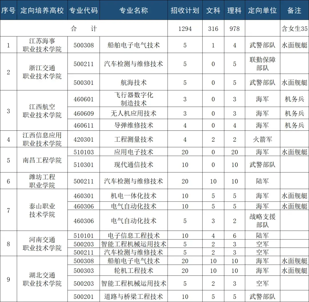 注意:定向士官需要在专科提前批进行报考。其次,并不是所有省市的考生都能报考定向培养士官,比如黑龙江、内蒙古、河北、天津、广东、广西等地就没有定向士官的招生计划,在报考前一定要了解清楚。