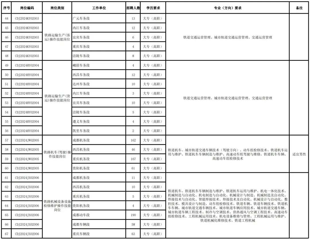 我们以成都局2024年校招为例,根据铁路系统的岗位专业需求表可以看到,大部分岗位对学历的要求放宽到了大专(高职),多个岗位的专业(方向)要求以铁道交通运营管理、铁道车辆、高速动车维修技术等铁路专业为主。