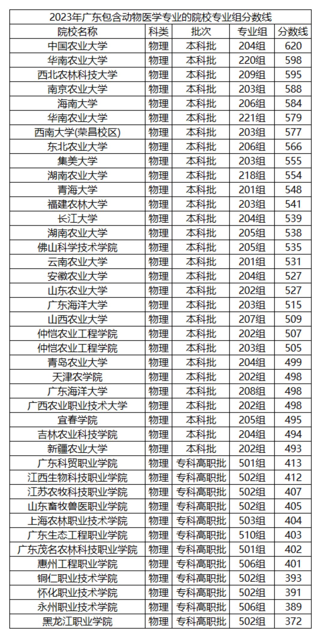 我们以广东为例,根据2023年在广东物理类招生,包含动物医学专业的院校专业组分数线来看,收分最高的是中国农业大学,投档录取分数线达到了620分,而分数线最低的是黑龙江职业学院,最低仅需要372分就能报考。