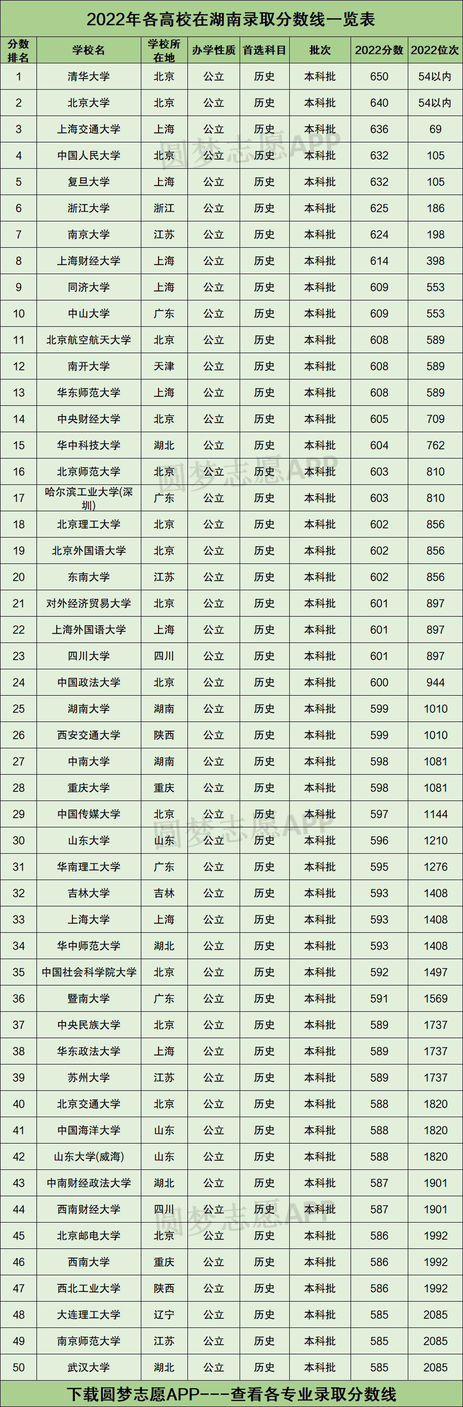 根据上图可知,2022年湖南高三历史类考生,只有成绩考到了585分以上、在全省历史类考生中排名前2085名,才有机会被全国50强大学录取!