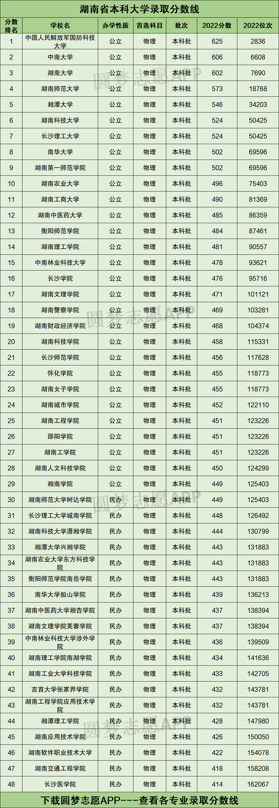 圆梦志愿根据考试院的数据,为大家整理了湖南省内所有本科大学2022年高考物理类的分数线及位次排名。具体见下图: