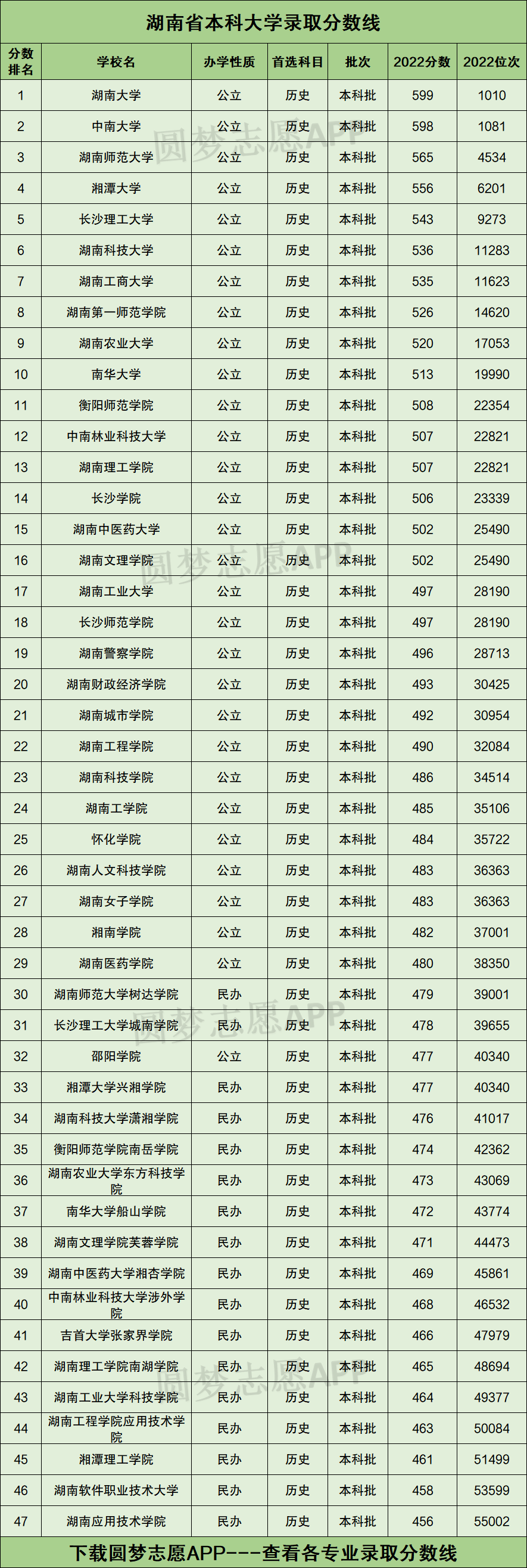 根据上图可知:湖南省历史类分数线最低的公立本科大学是邵阳学院,学校2022年高考历史类最低分为477分,最低位次为40340名。