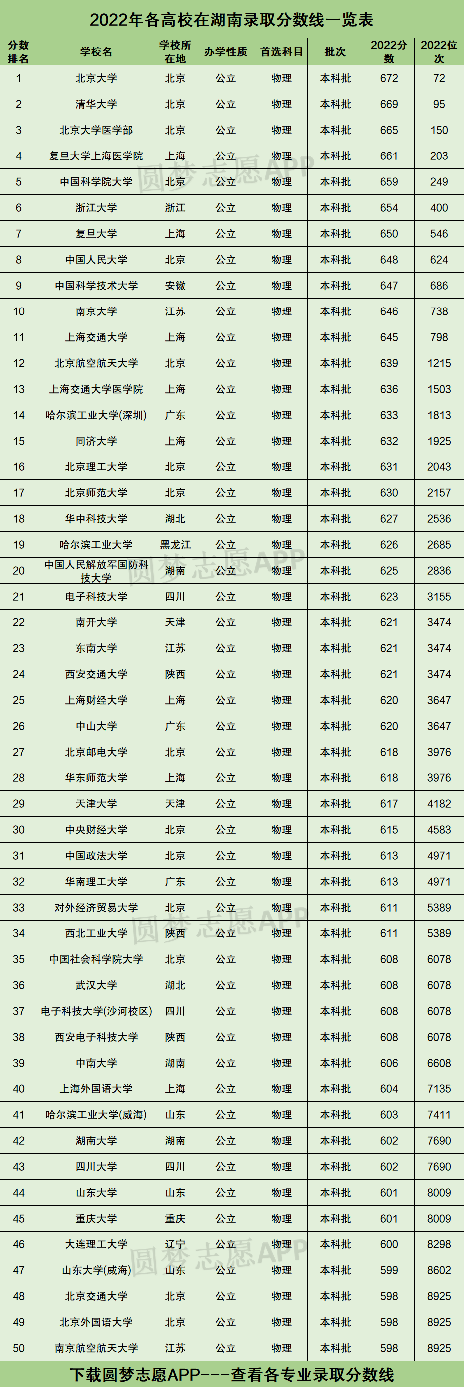 对于不想留在湖南省读大学的高三同学来说,全国各地的高校在湖南省的录取分数线则才是一份最有价值的参考资料。不过本文由于篇幅有限,将仅为大家展示2022年各高校在湖南录取分数线最高的前50所大学,如果你想查看全国近3000所大学在湖南省的录取分数线排名,可以在圆梦志愿APP中直接下载EXCEL表格。
