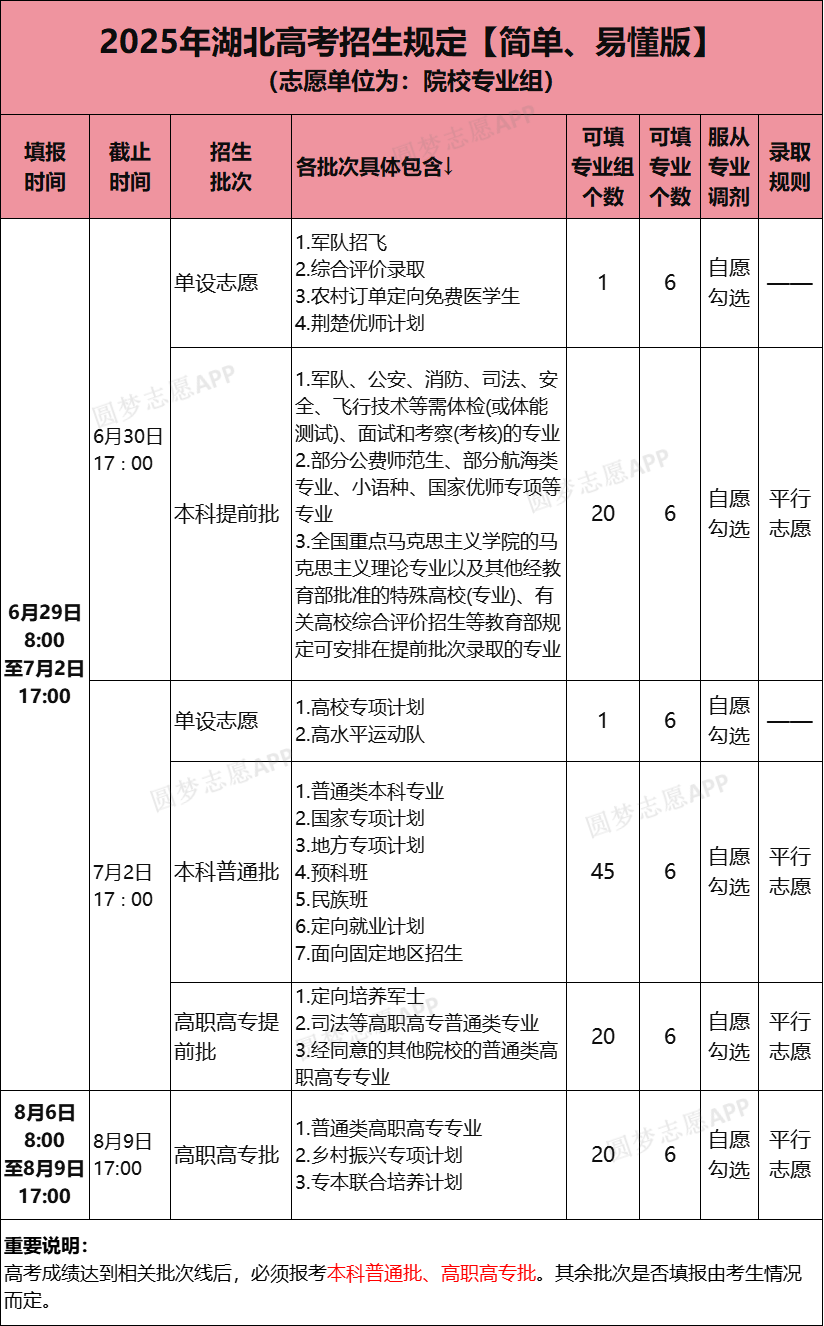 湖北新高考志愿模式为“院校专业组”,本科批设置45个平行志愿,每个院校专业组内可选6个专业。