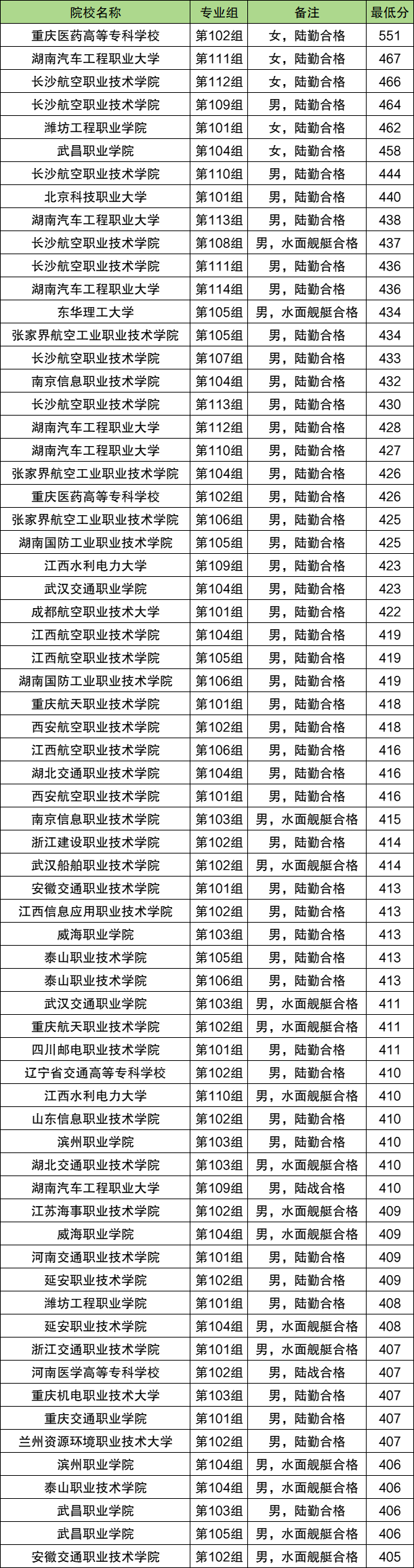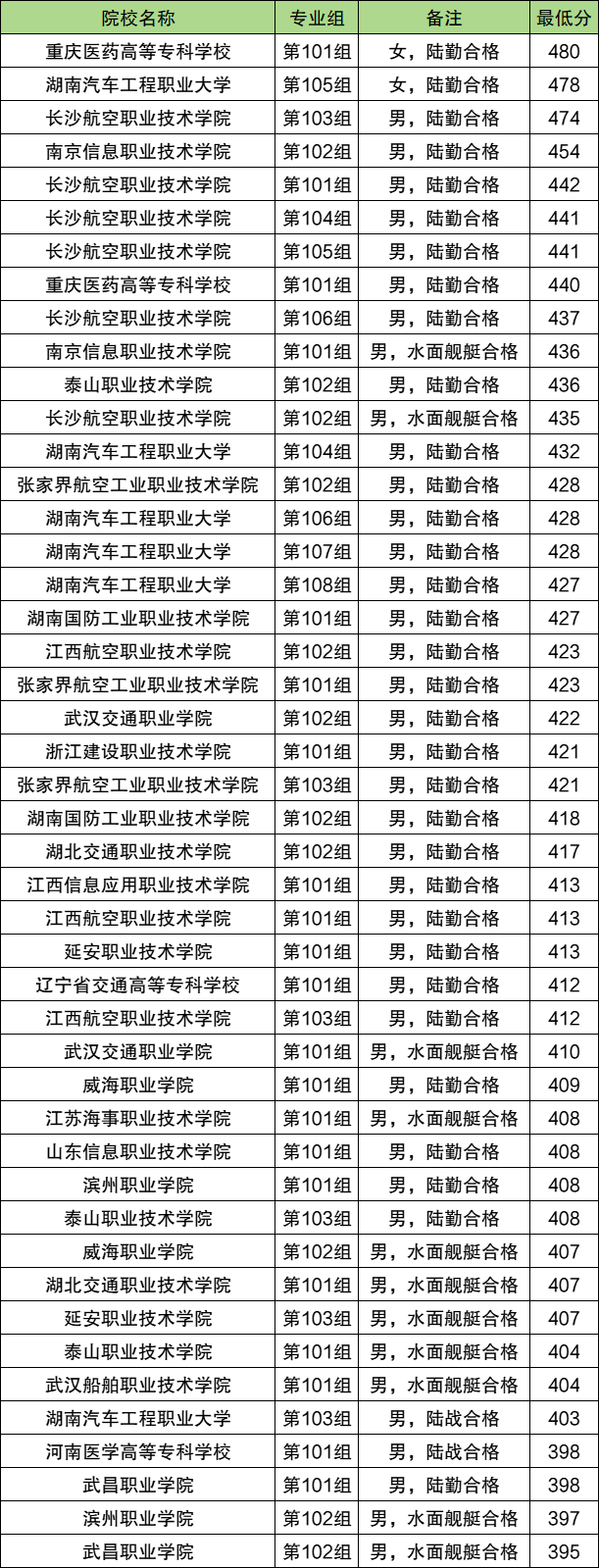 对于历史组的女生来说,招生学校只有两所,名单及分数线分别是:湖南汽车工程职业大学第105组(478分)和重庆医药高等专科学校第101组(480分)。