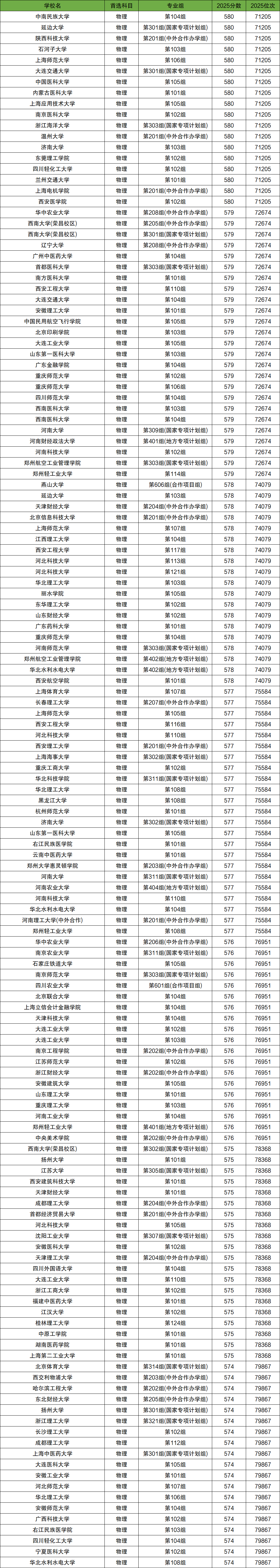 在7-8万名之间的物理类考生能上的学校有109所,对应的分数为580分~574分,对应位次为71205~79867位。