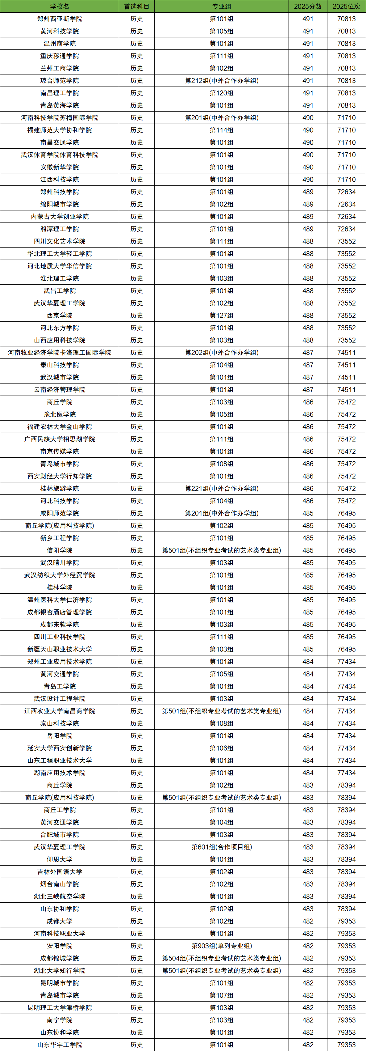 在7-8万名之间的历史类考生能上的学校有77所,对应的分数为491分~482分,对应位次为70813~79353位。
