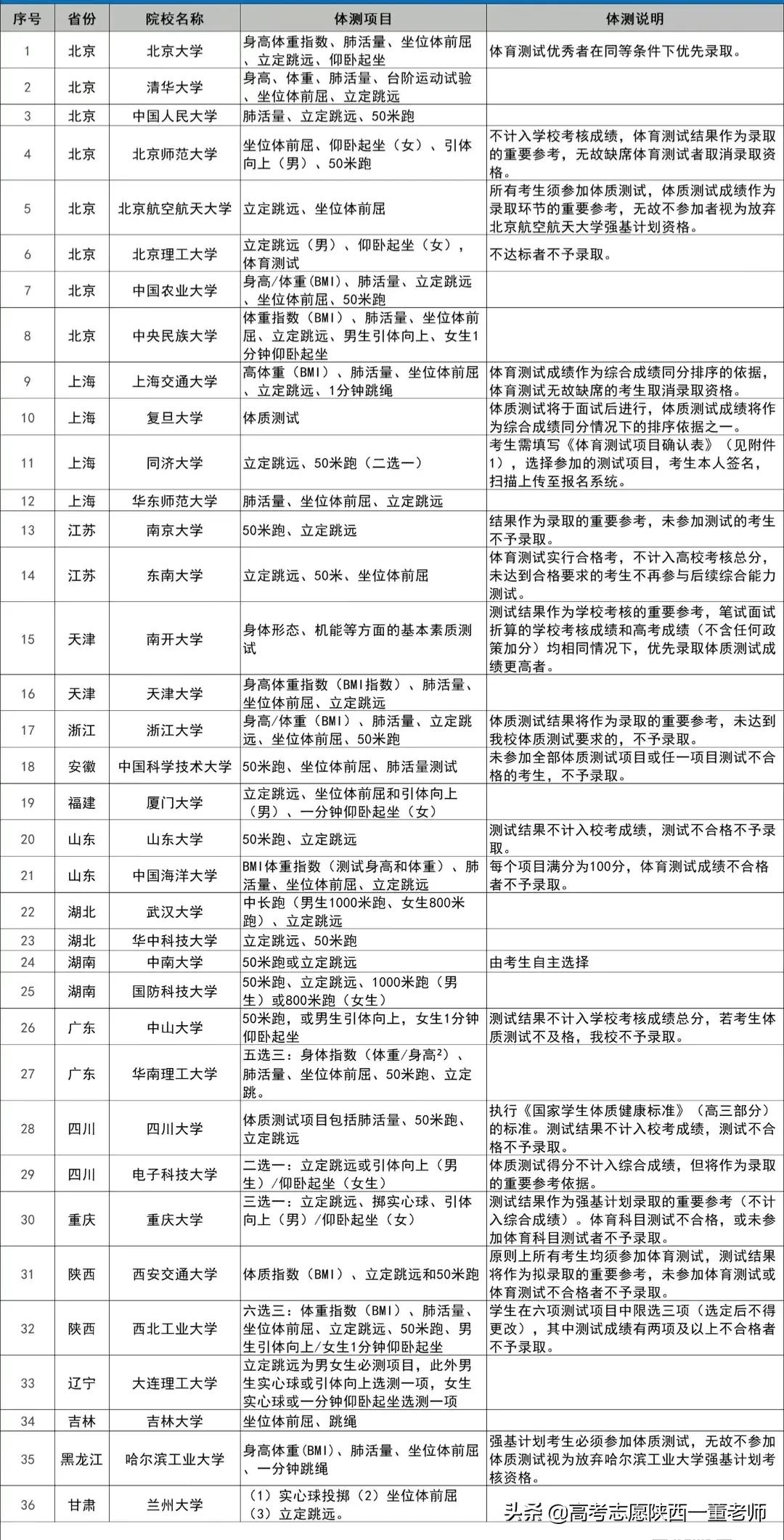 2020年强基计划院校招生体育测试要求
