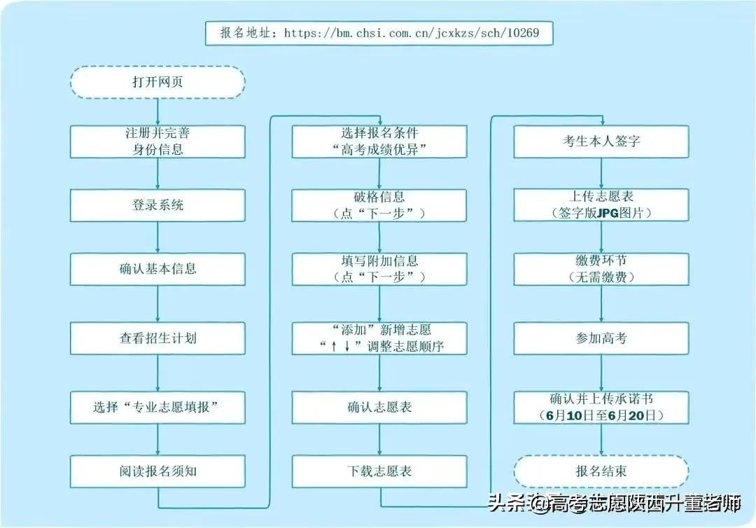 注册登录(教育部阳光网)—进入系统—查看报名须知—确认报名条件—查看破格信息—附加信息—选择志愿专业和是否调剂—确认志愿—下载志愿表—上传志愿表—交费—报名成功。