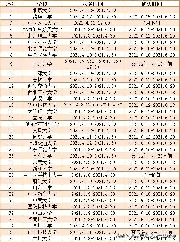 2021年强基计划各院校报名时间确认时间