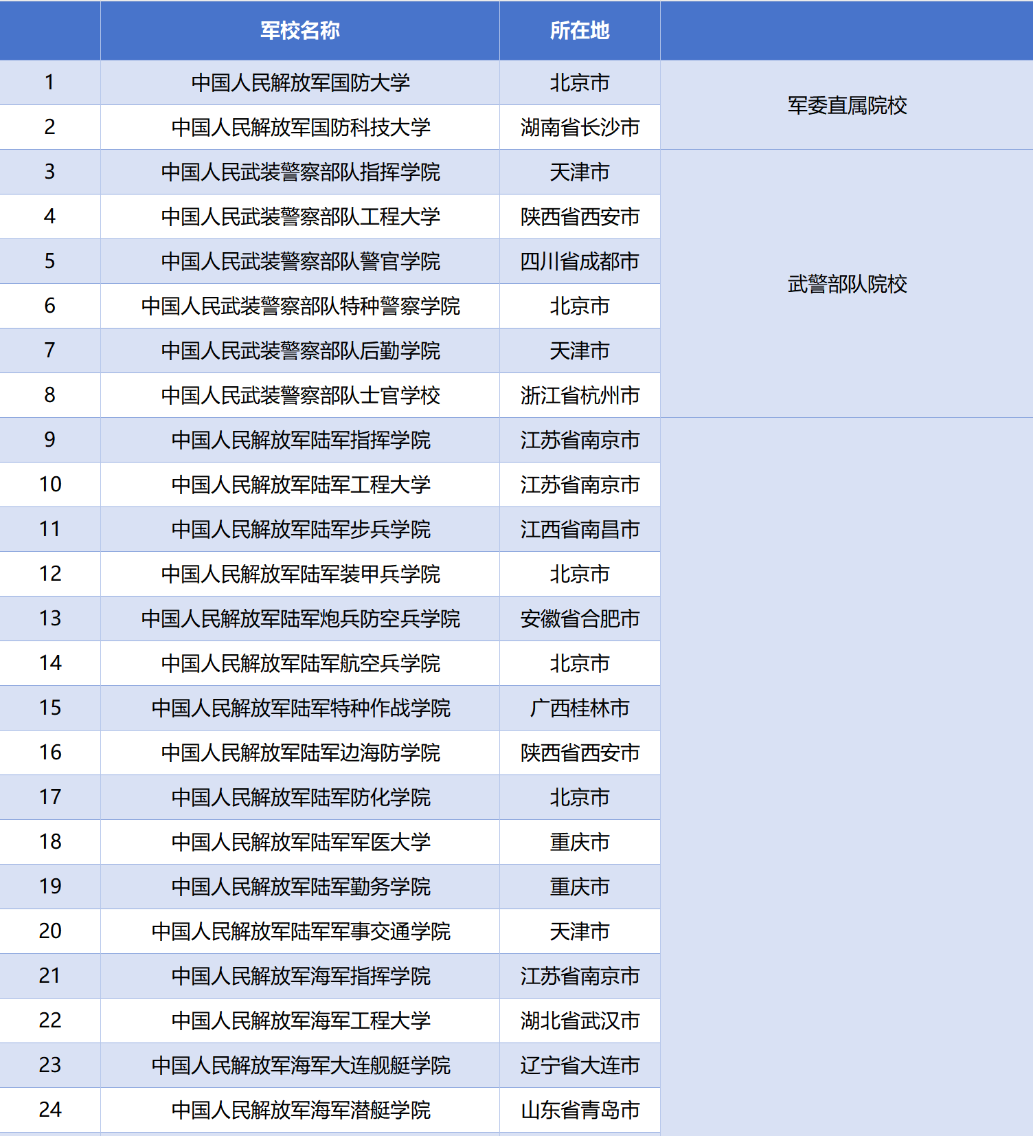 我国军校有哪些学校?总共有多少所?分布在哪些地区?本文为大家整理了军校大学的名单,仅供参考。