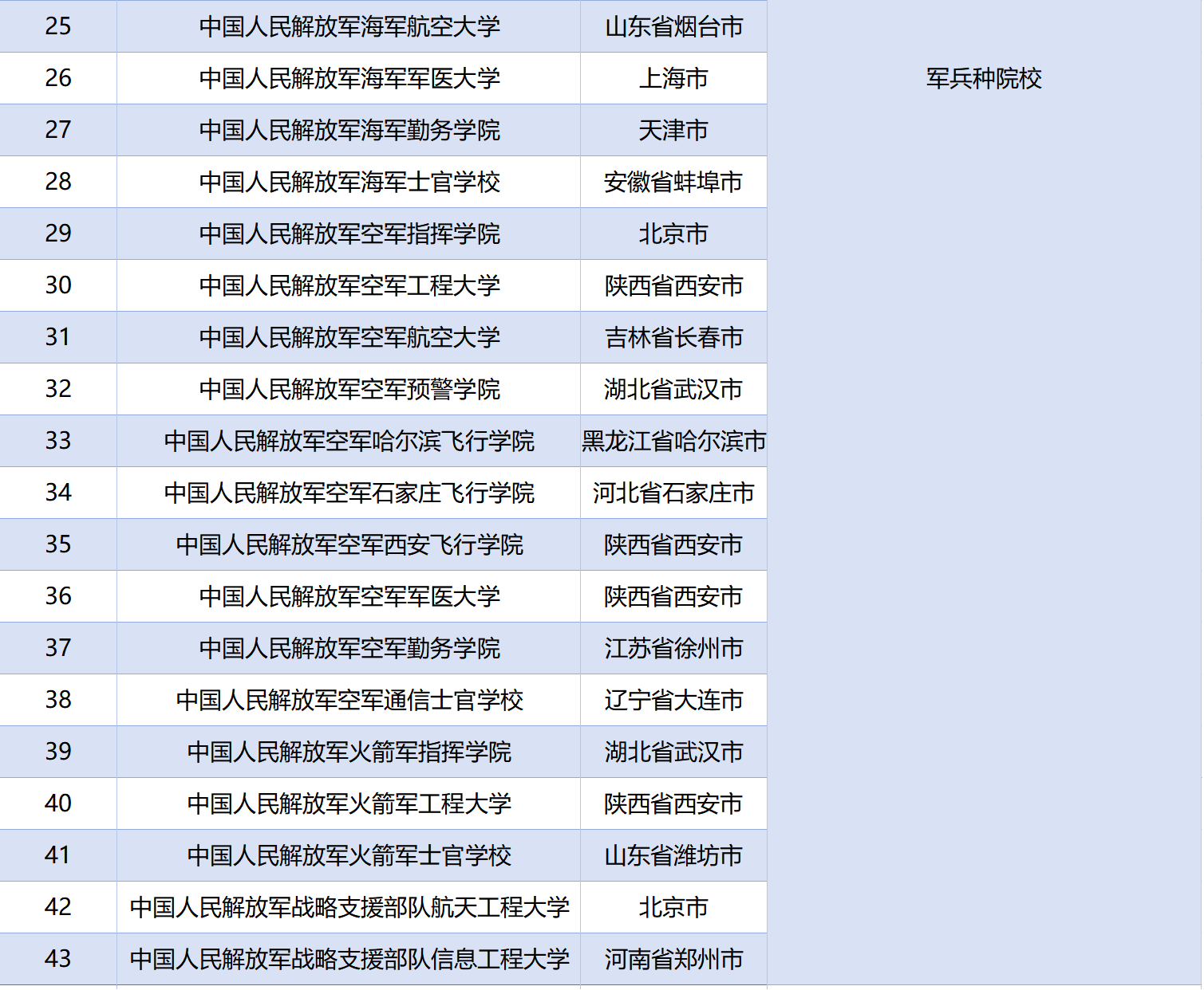 其中在北京的军校最多,分别是国防大学、陆军装甲兵学院、陆军航空兵学院、陆军防化学院、空军指挥学院、战略支援军航空工程大学、武警部队特种警察学院,共7所。
