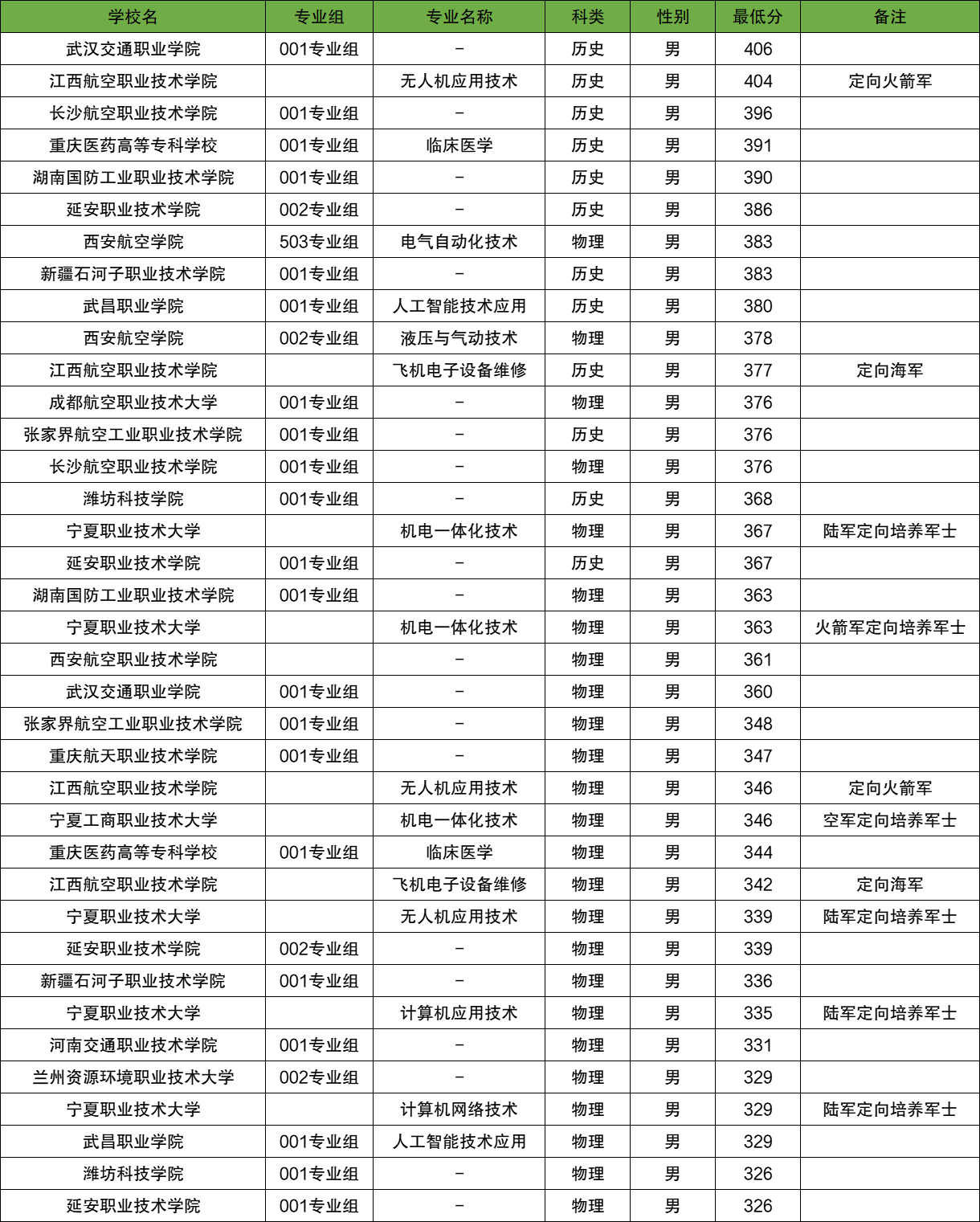 2025年共有两个士官专业组面向女生招生,分别是重庆医药高等专科学校第101组(480分)、湖南汽车工程职业大学计算机网络技术专业(478分)。