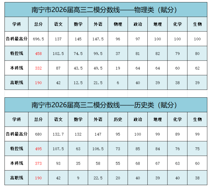 2026年南宁二模分数划线显示:历史类特控线495分、本科线373分,物理类特控线458分、本科线332分。