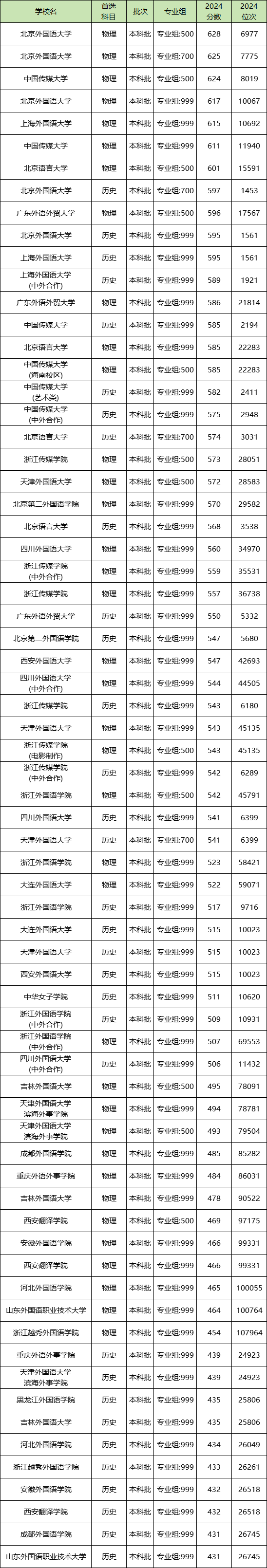 语言类大学第一名:中国传媒大学(物理类585分、历史类575分);语言类大学第二名:北京外国语大学(物理类617分、历史类595分);语言类大学第三名:北京语言大学(物理类585分、历史类568分)。