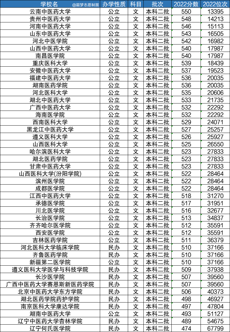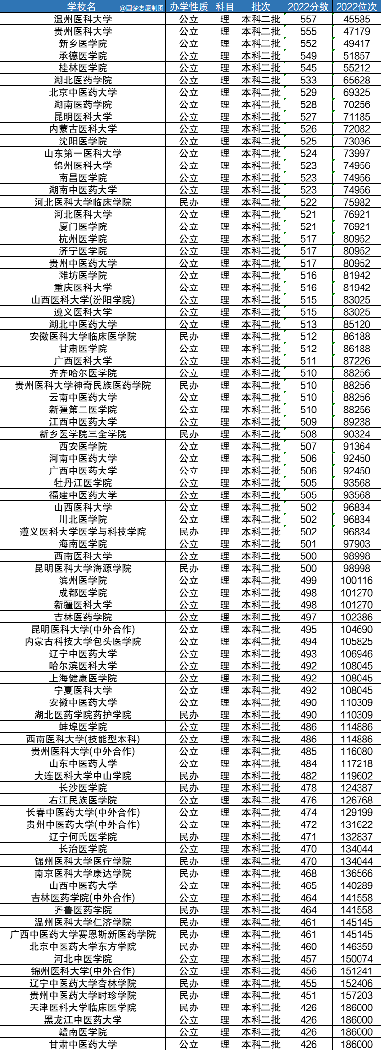 由于国内的医学院校会在全国大部分省份进行招生,但本文篇幅有限无法一一为大家整理出所有普通高考省份医学院校的录取情况。本文以四川省为例,根据四川省教育考试院公布的2022年招录数据,为大家整理出了医学院校在四川省文科和理科的最低录取情况,具体如下: