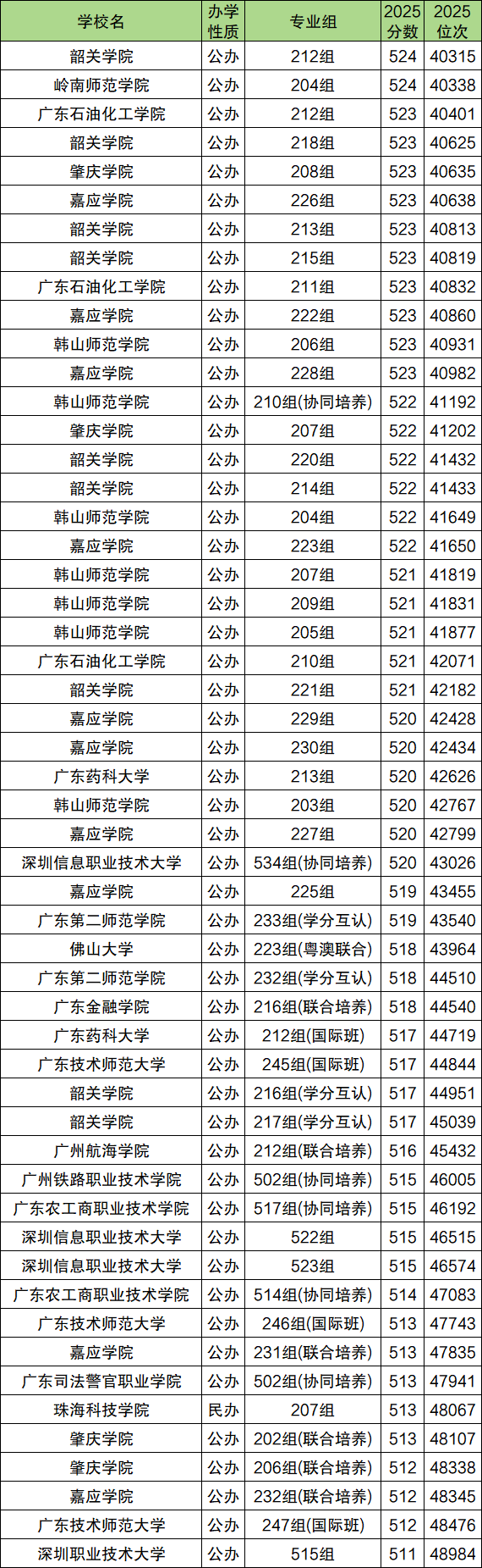 广东历史类高考位次4万名-5万名对应的省内大学专业组共计53个,其中分数最高为韶关学院212组,2025年分数524分,位次是40315名;分数最低为深圳职业技术大学515组,2025年分数511分,位次是48984名。