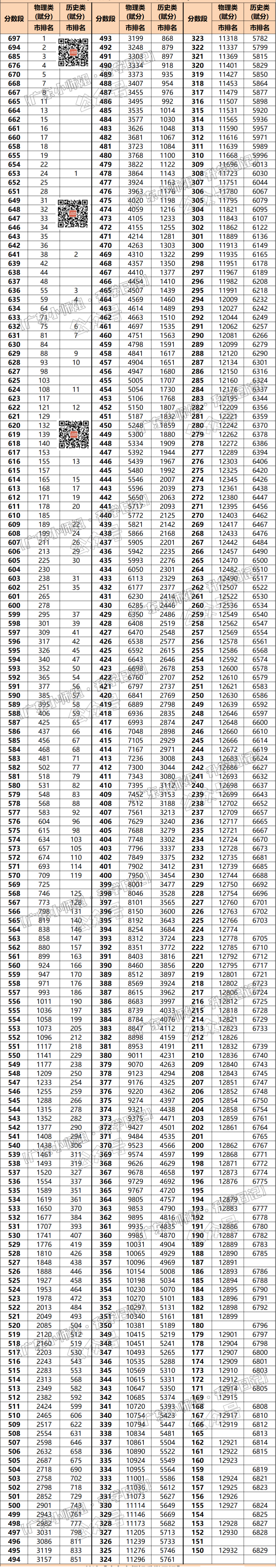 总人数(150分以上)12932人:最高分697分,市排名第一;高分段630分排名81名、620分排名132名;580分排名531位、510分排名2465位、470分排名4263位。
