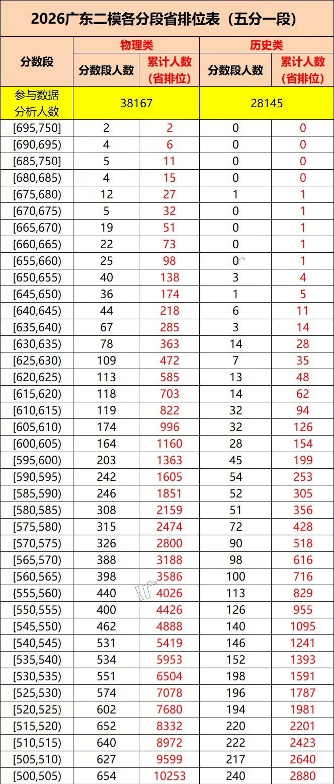 本期文章老师将整理2026年广东二模分数线及五分一段表汇总,并附上广东高考位次对应大学,方便2026年考生参考。