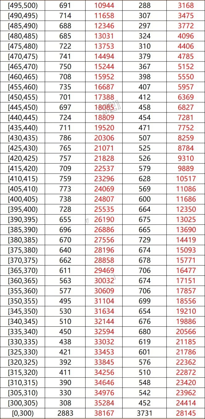 总人数38167人:最高分695分到700分,有2人;高分段680分到685分排名最低15名;630分到635分最低排名363名、620分到625分最低排名472名;580分到585分排名2159位、510分到515分排名8972位、470分到475分排名14494位。