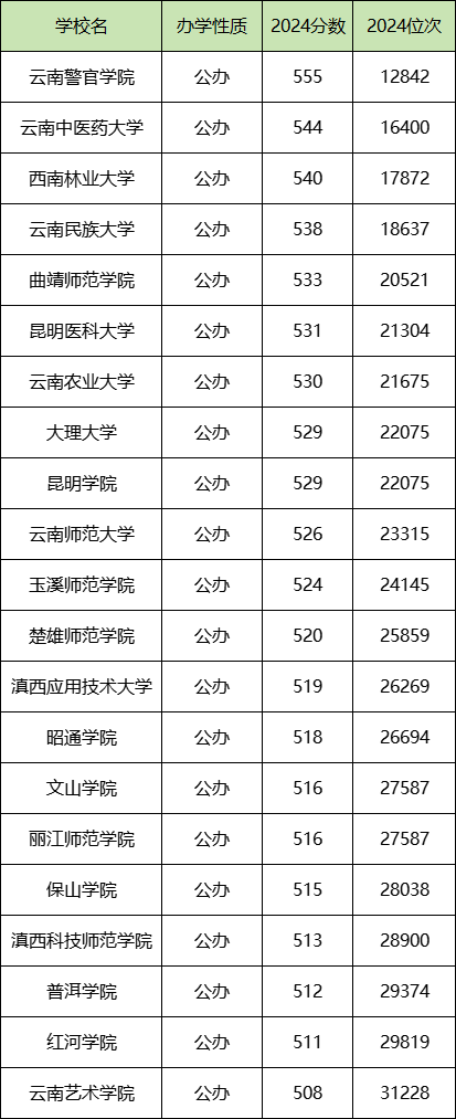2024年云南公办二本大学在文科的录取分数线位于508分~555分之间(不含普通考生无法报考的特殊专业)。