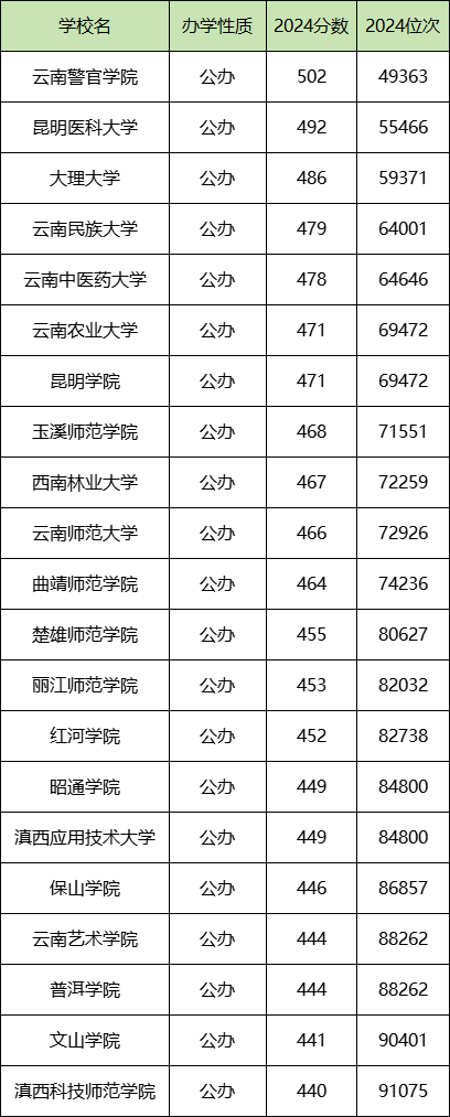 2024年云南公办二本大学在理科的录取分数线位于440分~502分之间(不含普通考生无法报考的特殊专业)。