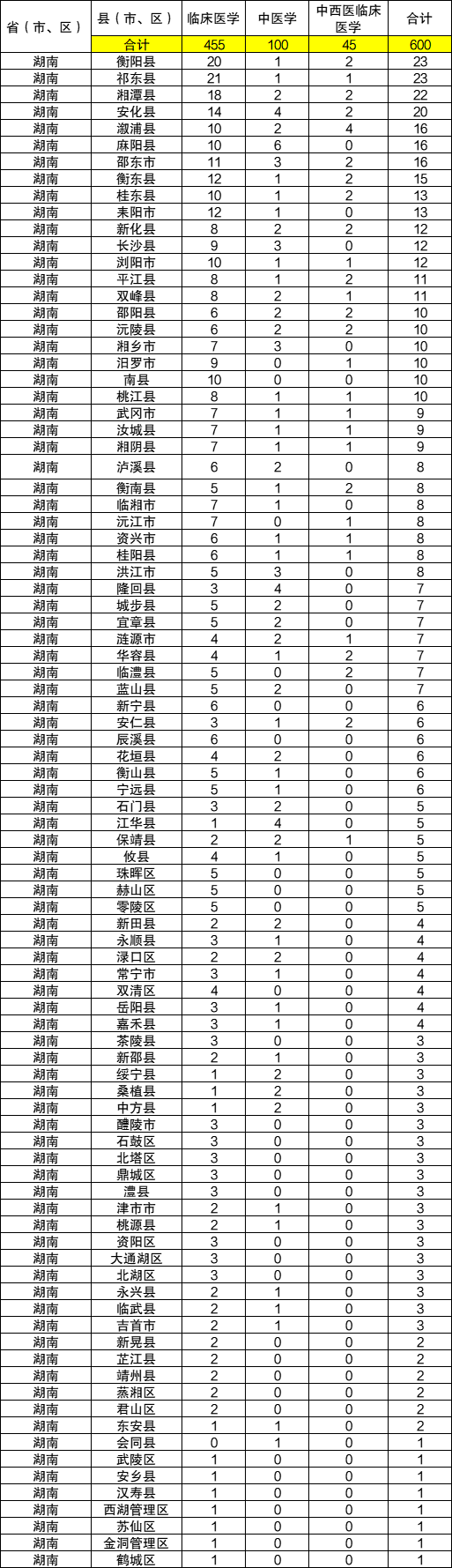 安化县:共计20人,其中临床医学14人、中医学4人、中西医临床医学2人。