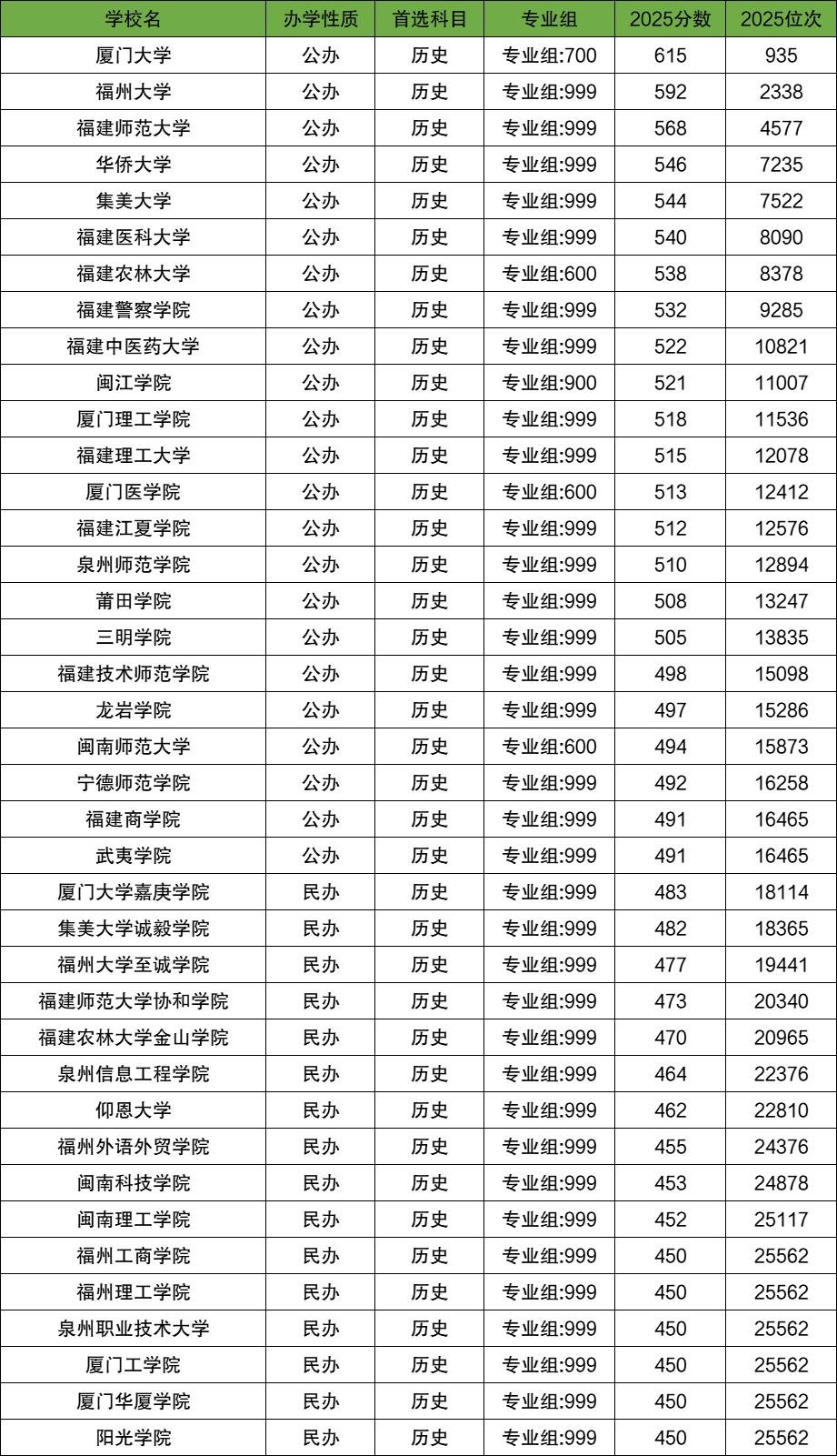 2025年福建本科各大学在福建历史类最低录取分数线位于450分-615分范围内,位次位于25562名-935名之间。