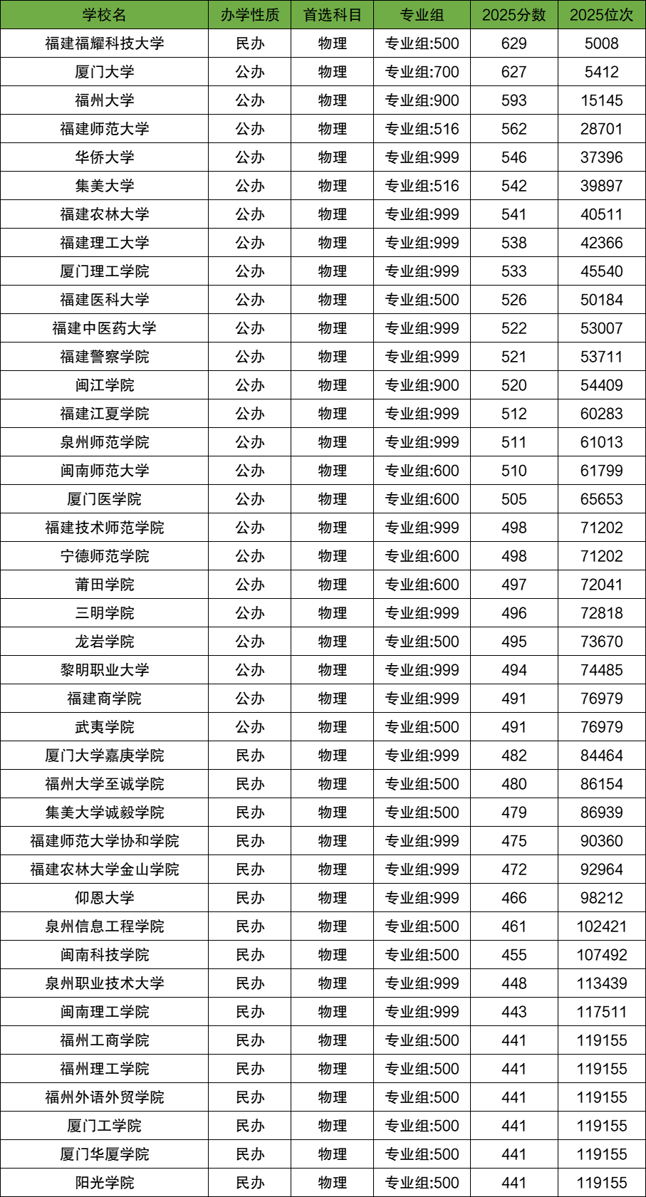 2025年福建本科各大学在福建物理类最低录取分数线位于441分-629分范围内,位次位于119155名-5008名之间。