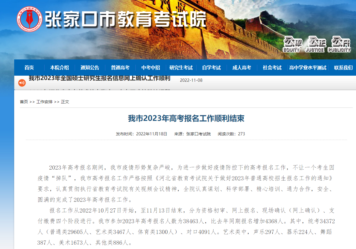 据悉,张家口市参加2023年高考报名人数为38463人,比去年同期报名增加4368人。其中,统考34372人(普通类29605人、艺术类3467人、体育类1300人)、对口4091人。艺术类中,声乐297人、器乐224人、舞蹈387人、美术1673人、其他类886人。
