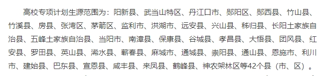 2026湖北高校专项计划实施区域涵盖42个县(市、区),包括阳新县、武当山特区、丹江口市等,具体实施区域名单如下: