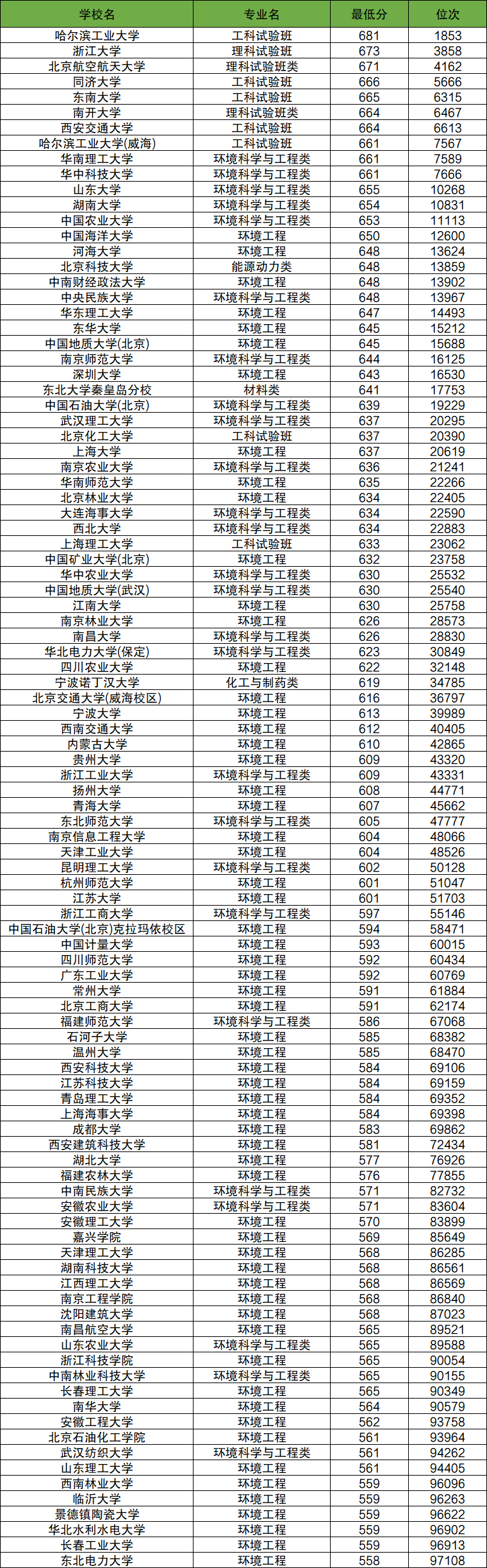以下为全国环境工程专业在浙江省的分数线前100名大学,上文已介绍最好的大学多少分能上。想要考上环境工程专业的最低分并不高,为508分,只要在全省153246名以上就有机会。