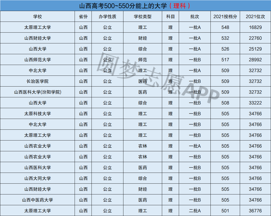 山西省一本理科线为505分,那么在500~550分这个分段内基本上能够报考的都是一本大学,如下所示: