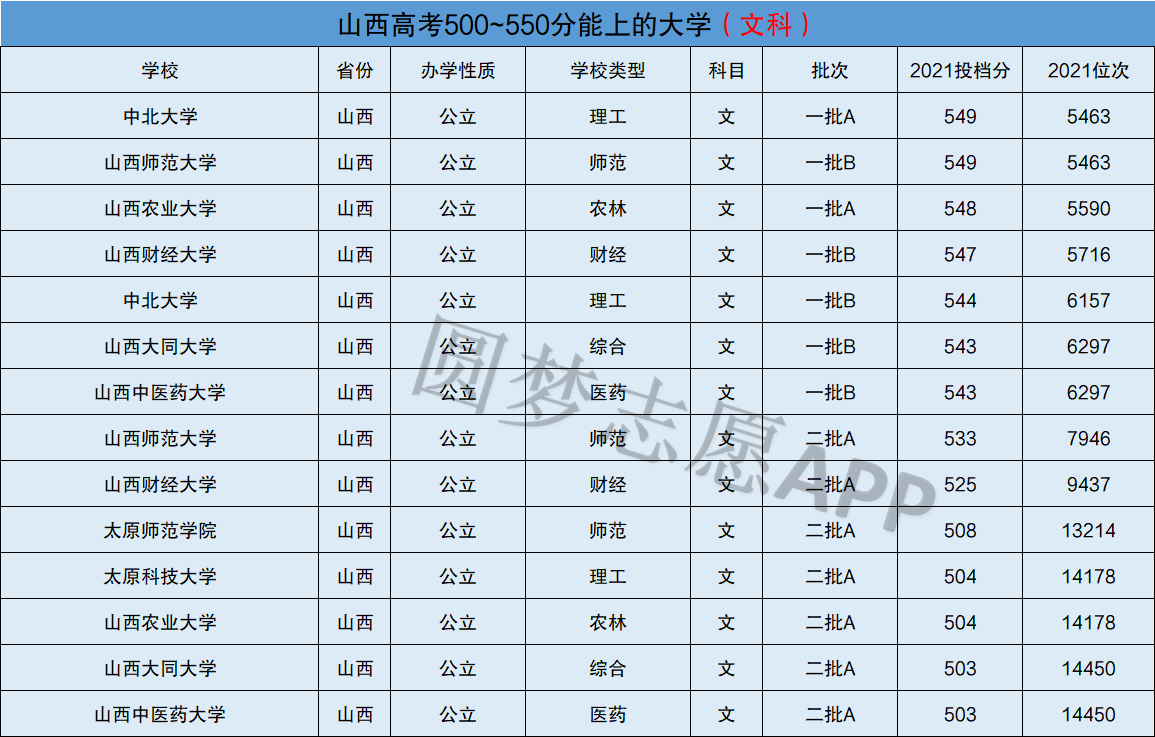 山西省一本文科线为543分,那么在500~550分这个分段内能够报考的大学都比较不错。