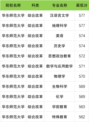 最高分对应院校及专业为:华东师范大学汉语言文学、地理科学专业(577分);