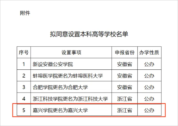 据教育部官方网站11月20公布的消息,嘉兴学院改名为嘉兴大学已进入拟同意更名公示阶段,相信在公示结束不久后,就可以正式挂牌更名。