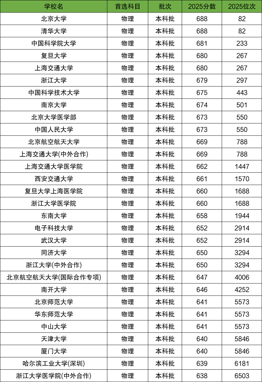 录取分数线在前30强的本科大学为:北京大学(688分)、清华大学(688分)、中国科学院大学(681分)、复旦大学(680分)、上海交通大学(680分)等。