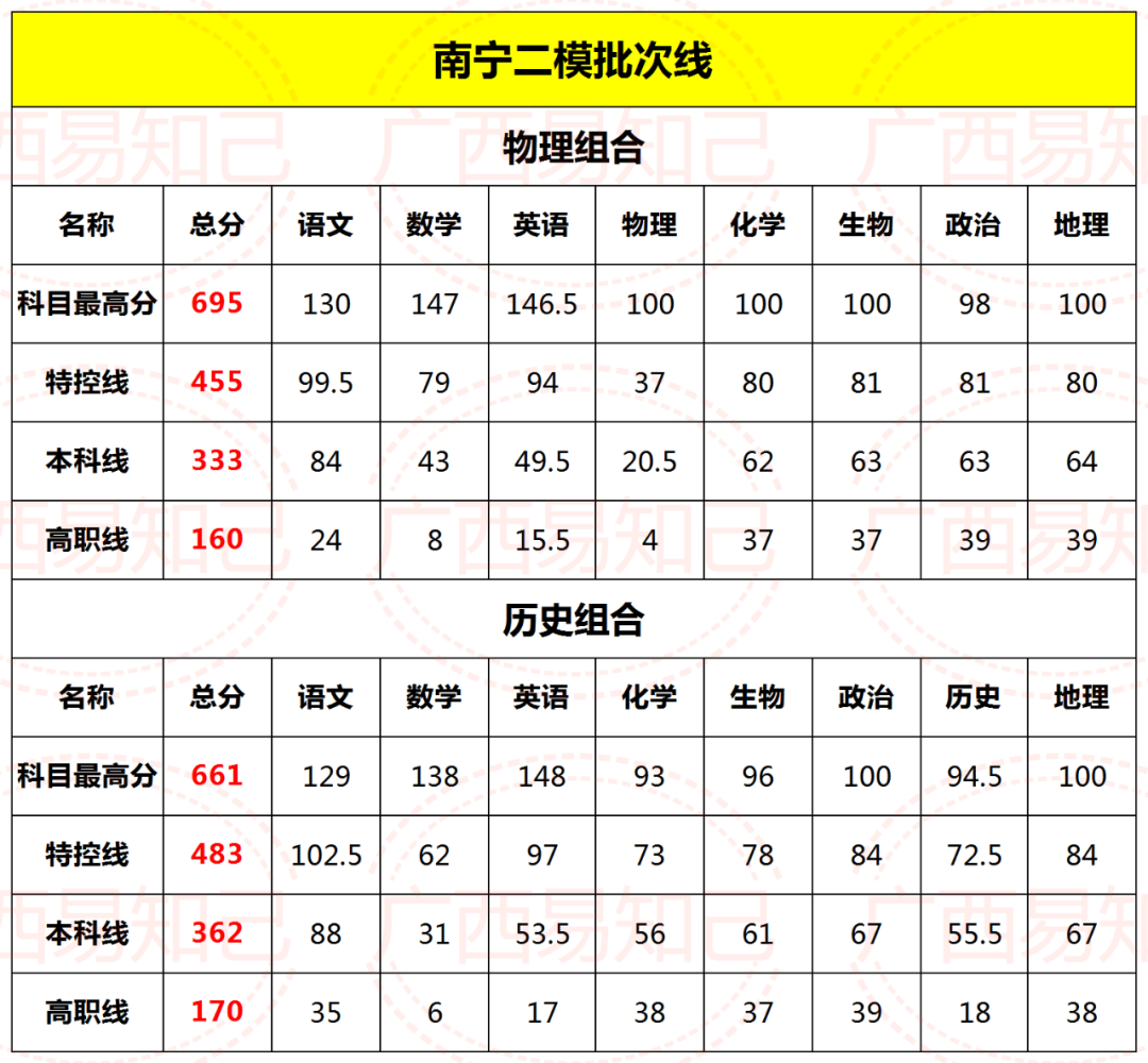 2025年南宁二模分数线出炉:物理组合特控线455分、本科线455分;历史组合特控线483分、本科线362分。南宁市二模成绩物理类670分对应2024年高考678分,排名为74名;历史类二模分数600分对应高考分数为617分,高考排名为639名。