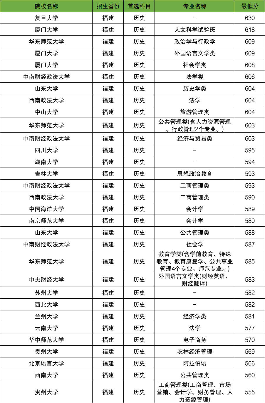 下表为所有大学在福建省历史类的专业及分数线。