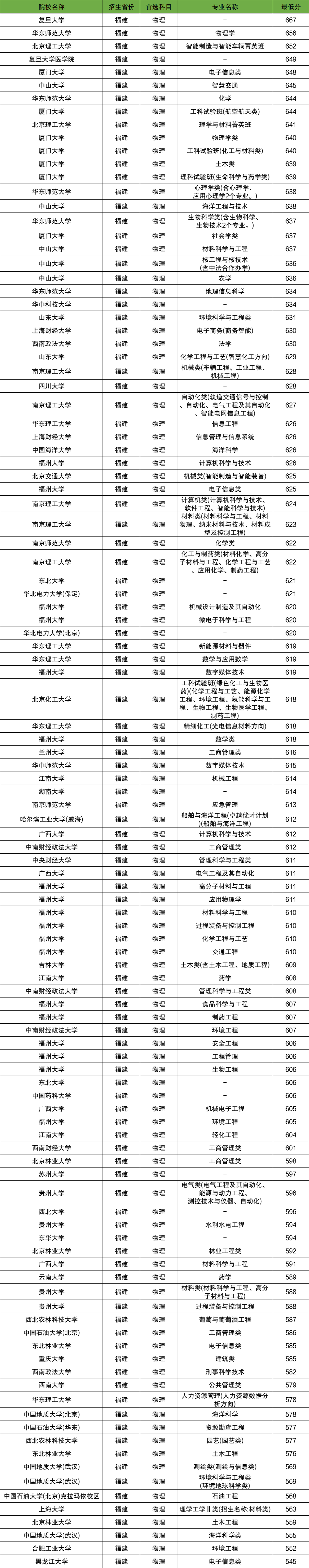 下表为所有大学在福建省物理类的专业及分数线。