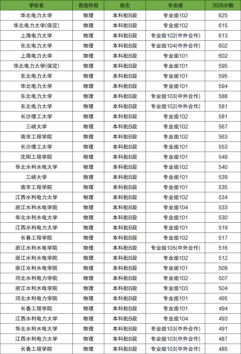 其中最低分院校为长春工程学院(专业组103中外合作),2025年最低分为485分。最高分院校为华北电力大学(专业组102),2025年最高分为625分。