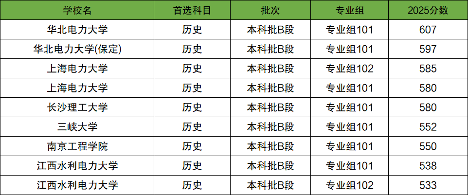 其中最低分院校为江西水利电力大学(专业组102),2025年最低分为533分。最高分院校为华北电力大学(专业组101),2025年最高分为607分。