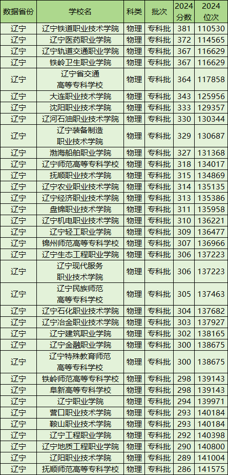 下面是2024年辽宁省公办大专院校分数线排名物理类一览表: