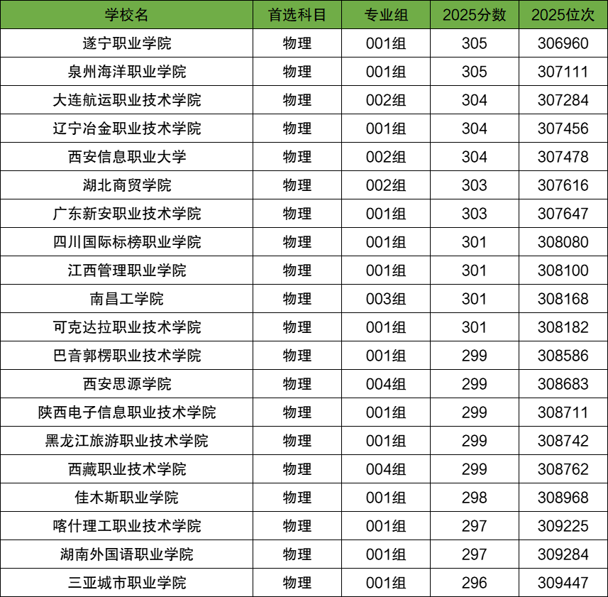 300分左右能上的院校专业组有23个,都属于普通的高职院校。其中分数较高的有运城幼儿师范高等专科学校专业组101、三亚理工职业学院专业组102、广州康大职业技术学院专业组101,这些院校的录取线都在305分,位次在163906以内。