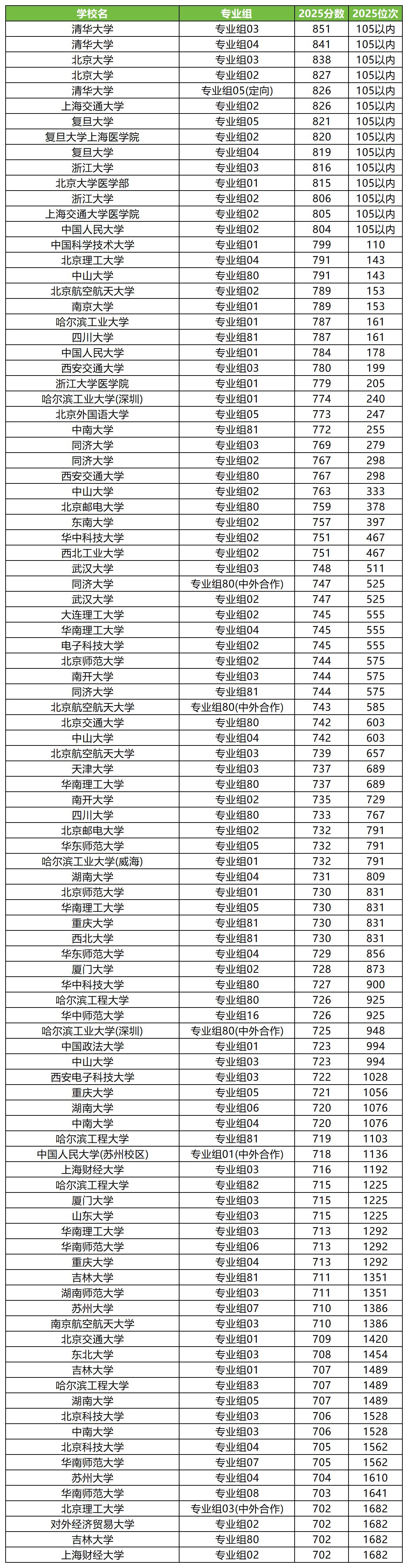 2025年录取分数线最高的是清华大学03组,最低851分,位次是105以内;另外分数线排在前五的全部都是清北这两所院校的专业组,进入前十的还有上海交通大学02组、复旦大学05和04组、浙江大学03组。