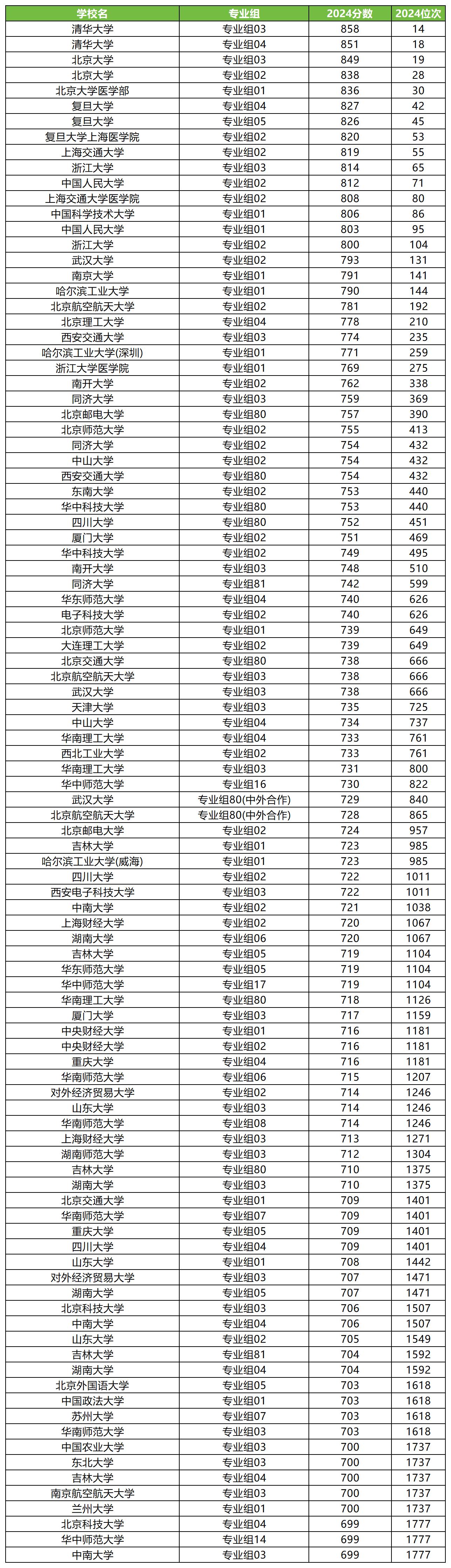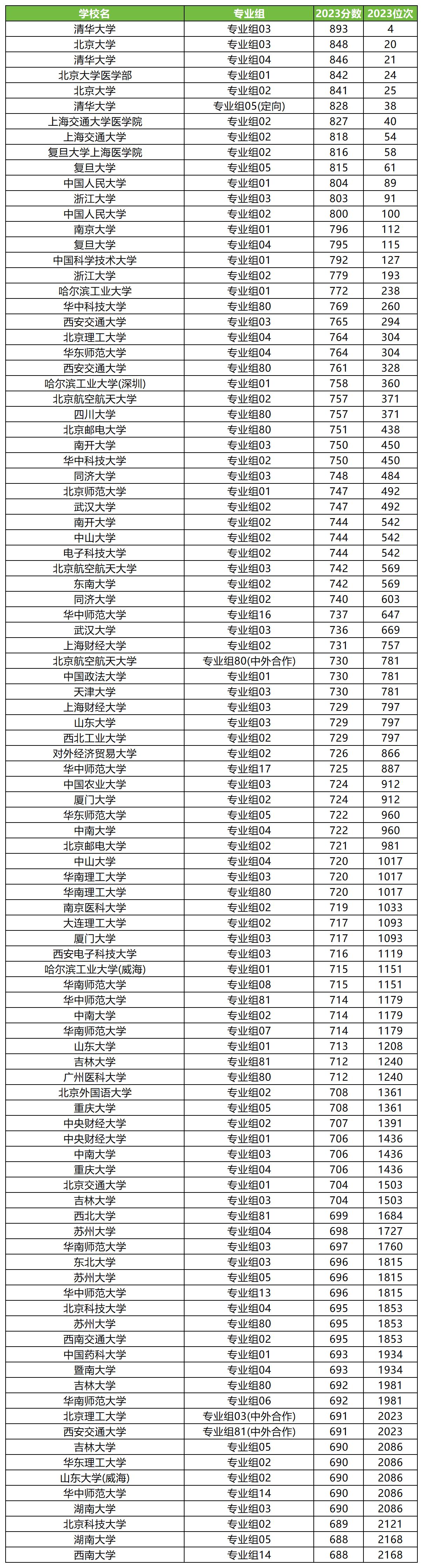 这些院校专业组的最低分均在810分及以上,对应最低位次是105以内,也就是说全省只有100多名考生能上。