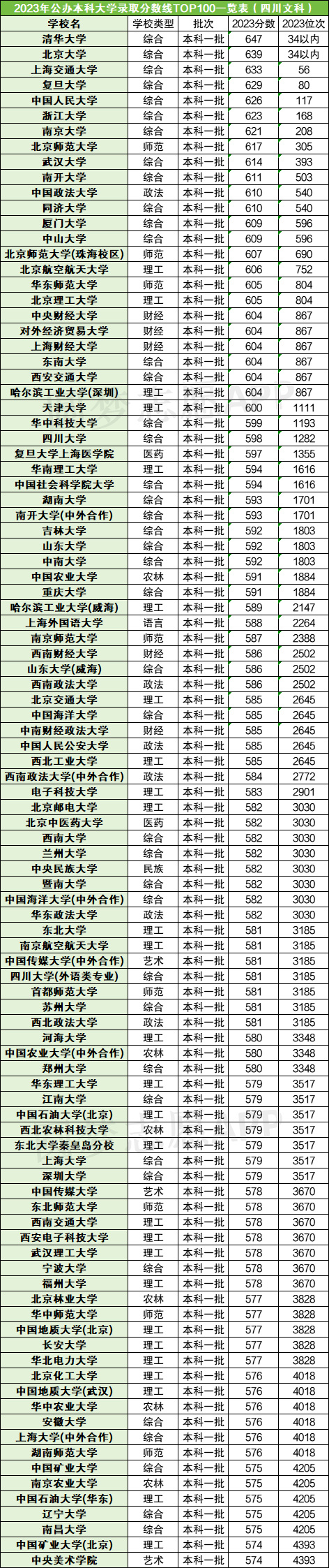小编在此从分数线的角度,整理了2023年四川文科分数线排名前100的院校名单,如下: