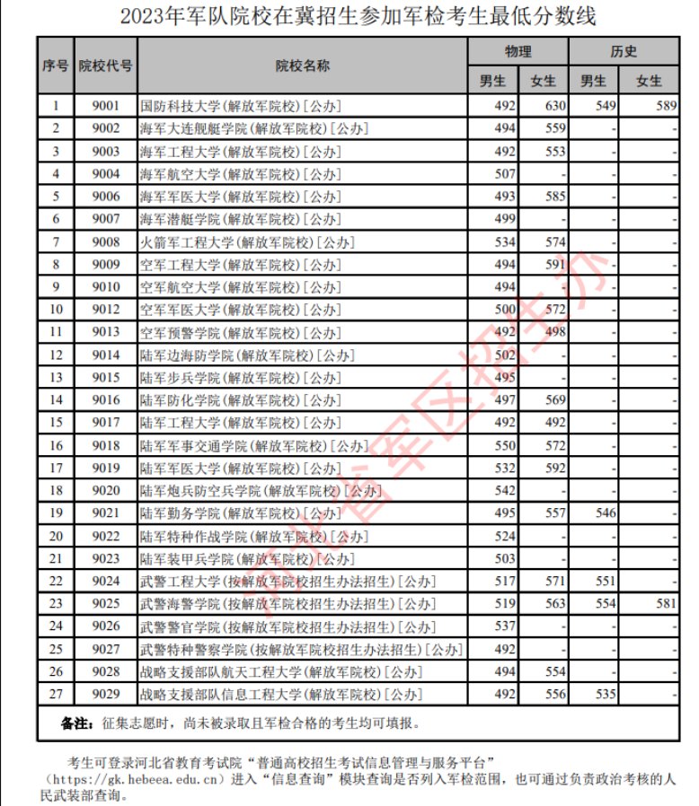 军队院校2023年在河北省招生面试、体检控制分数线: