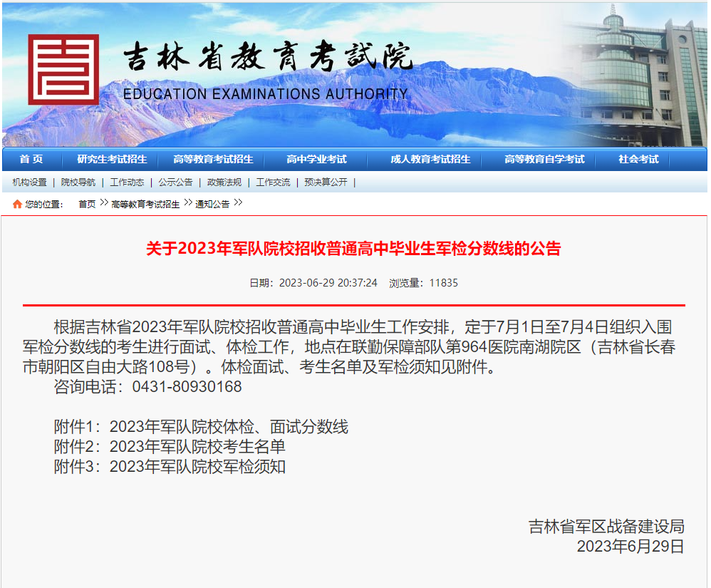 2023年在吉林招生军队院校参加面试体检最低分如下: